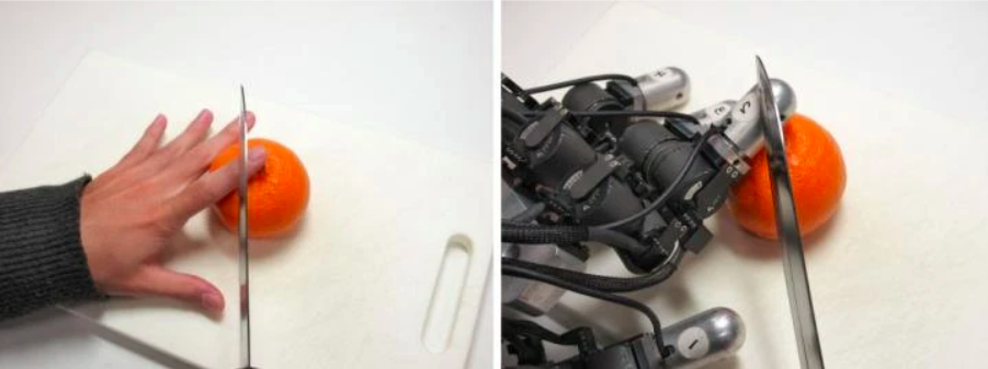 ▲研究人员发现,人们看这两张图片,同样会对刀切割机器人的手表现出共情神经反应
